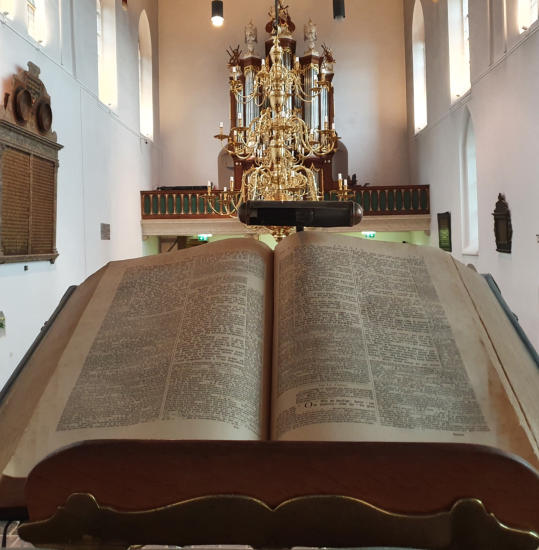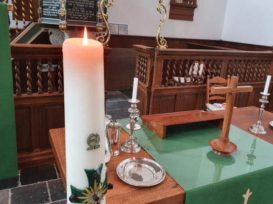 De eerste psalmEen rots in de liturgische branding – dat is de psalm waarmee we onze dienst beginnen. Deze psalm (ook wel introïtus- of intochtspsalm genoemd) verbeeldt onze verbondenheid met het volk Israël. Door deze eeuwenoude teksten laten we ons opnemen in de weg van God en zijn volk, zoals die zich door de geschiedenis heen heeft ontvouwd. Elke zondag van het kerkelijk jaar kent zijn eigen intochtspsalm. Ook binnen de RoomsKatholieke traditie klinken ze op dezelfde zondagen. De psalm die op een bepaalde zondag wordt gezongen, sluit doorgaans aan bij de thematiek van de lezingen. Omdat we werken met een driejarig leesrooster, past de psalm het ene jaar soms beter bij de lezing dan het andere. In protestantse kerken zingen we de psalmen op melodieën die halverwege de zestiende eeuw op initiatief van Johannes Calvijn zijn gecomponeerd. Deze melodieën zijn zo vormgegeven dat de hele gemeente de volledige psalm kan meezingen. Ze bezitten een tijdloze schoonheid en vormen een kostbaar (protestants) erfgoed waar we met recht zuinig op mogen zijn. Kyrie en gloriaEen belangrijk onderdeel van de voorbereiding is de roep om ontferming over de nood van de wereld. Aan het begin van de dienst brengen we onze gedachten over wat er speelt in de wereld mee naar binnen. We leggen bij God neer waar mensen vastlopen, wat hen benauwt, en wat onze wereld uit balans brengt. Om het evenwicht te hervinden, zingen we een Glorialied - een lied dat getuigt van Gods goedheid en trouw. Geprezen zij Zijn naam: Hij is er nog steeds. Kyrie en Gloria vormen samen een geheel. In het Kyrie vragen we om Gods ontferming; in het Gloria prijzen we Hem omdat Hij naar ons omziet. Zo houden we het vol om te leven vanuit geloof, hoop en liefde. Een treffend voorbeeld van een Glorialied is lied 302: God in den hoog’ alleen zij eer. Dit lied laat zien dat het Gloria niet enkel lofprijzing is. Halverwege klinkt opnieuw de vraag om Gods ontferming. Lofprijzing en het vragen om ontferming zijn dus nauw met elkaar verbonden - ze versterken en verdiepen elkaar. Moment voor de kinderen‘En dan mogen nu de kinderen naar voren komen…’ In elke dienst is er een moment speciaal voor de kinderen. Een interactie tussen predikant en de aanwezige kinderen. De predikant kan bijvoorbeeld een verhaaltje vertellen of een vraag stellen. Het is vaak een van de weinige momenten waarop de kinderen even écht onderdeel zijn van de eredienst.Na dit moment (en ook als er geen kinderen zijn) wordt een kaars aangestoken. Het ontwerp op de kaars is hetzelfde als dat op de Paaskaars, om de verbondenheid tussen de kinderen en de rest van de gemeente te laten zien. De kaars gaat mee naar de ruimte waar de kindernevendienst plaatsvindt. Het teken dat Christus nabij is, ook onder de kinderen. Aan het eind van de dienst komen de kinderen weer terug in de kerkzaal, om het einde van de dienst samen met de volwassenen te vieren. De kaars wordt dan weer op de tafel, bij het andere licht, geplaatst.
